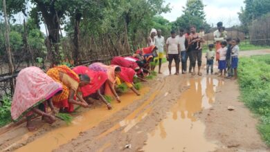 ग्रामीणों ने सड़क पर धनरोपनी कर किया प्रदर्शन