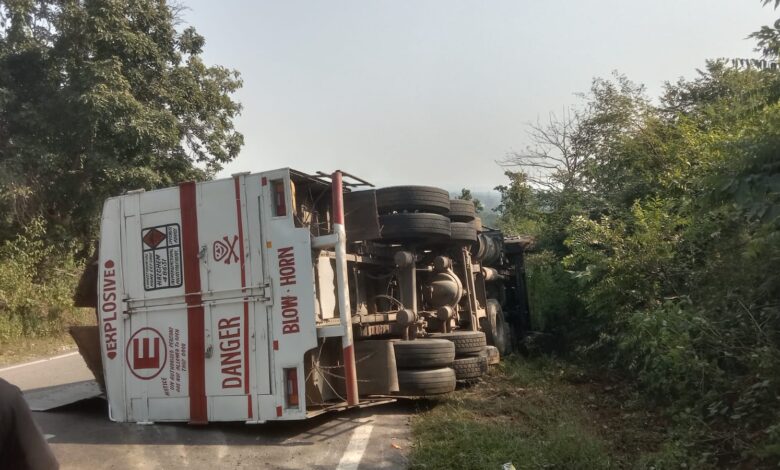 बारूद लदा ट्रक पलटा, बड़ा हादसा टला