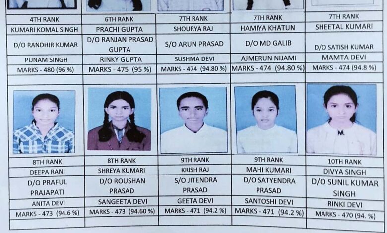 शौर्य राज, हामिया खातून और शीतल कुमारी ने 94.8 प्रतिशत अंक ला कर सातवां स्थान प्राप्त किया है. दीपा रानी व श्रेया कुमारी ने 94.6 प्रतिशत कर आठवां, कृष राज व माही कुमारी ने 94.2 प्रतिशत अंक ला कर नौं तथा दिव्या सिंह ने 94 प्रतिशत अंक हासिल कर दसवां स्थान प्राप्त किया है. विद्यालय प्रबंधन से सफल छात्र व छात्राओं को शुभकामनायें दी है.बता दें कि इस वर्ष विद्यालय से कुल 118 छात्र व छात्राओ ने मैट्रिक की परीक्षा दी थी और सभी प्रथम श्रेणी से उर्तीण हुए.