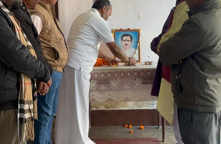 लातेहार। जिला कांग्रेस मीडिया प्रभारी पंकज तिवारी के बाज़कुम स्थित आवासीय परिसर में बुधवार को समाजसेवी स्वर्गीय पंडित विद्यार्थी तिवारी की 36वीं पुण्यतिथि श्रद्धा एवं सम्मान के साथ मनाई गई. इस अवसर पर स्वर्गीय विद्यार्थी तिवारी के चित्र पर उनके जेष्ठ पुत्र पंकज तिवारी समेत अन्य लोगों ने माल्यार्पण किया. इसके बाद सभी लोगों ने दो मिनट का मौन धारण कर दिवंगत आत्मा की शांति के लिए प्रार्थना किया. कार्यक्रम में उपस्थित लोगों ने स्व. तिवारी को एक समाजसेवी के साथ साथ एक मिलनसार एवं प्रभावशाली व्यक्तित्व का धनी बताया और हुए उनके सामाजिक योगदान को याद किया. मौके पर समाजसेवी ललित पांडेय, व्यवसायी मदन प्रसाद, कांग्रेस अल्पसंख्यक प्रकोष्ठ के जिला उपाध्यक्ष रब्बानी हुसैन, लातेहार जिला वॉलीबॉल संघ के सचिव प्रवीण मिश्रा, कोषाध्यक्ष नीरज कुमार, कांग्रेस नेता अमित उरांव, युगेश्वर सिंह खरवार, उत्कर्ष राज, शमशेर अंसारी समेत अन्य गणमान्य लोग मौजूद थे.