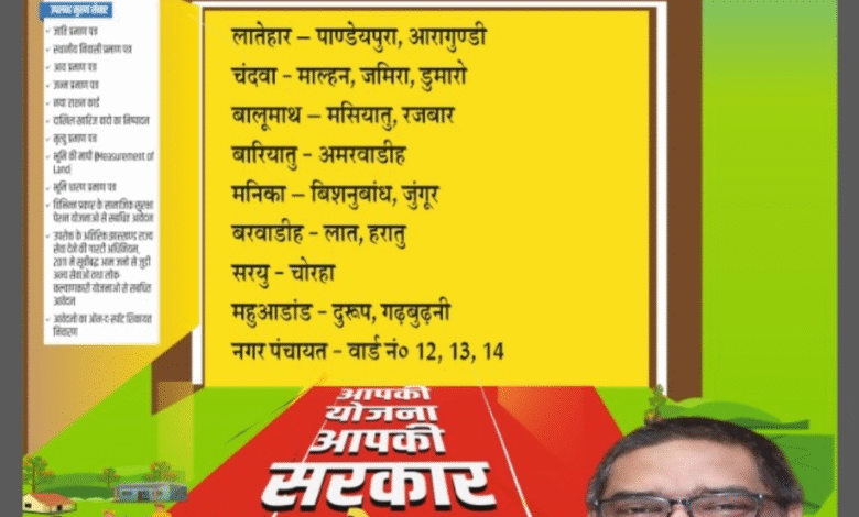 लातेहार। झारखंड सरकार के निर्देश पर आपकी योजना, आपकी सरकार, आपके द्वार कार्यक्रम के सेवा अधिकार सप्‍ताह के तहत 28 नवंबर को नगर पंचायत क्षेत्र के वार्ड संख्‍या 12 के अमवाटीकर स्‍कूल में विशेष शिविर का आयोजन किया जायेगा. इस शिविर में वार्ड संख्या 12, 13 और 14 के लोगों की समस्याओं का समाधान किया जायेगा और उन्‍हें सरकारी योजनाओं की जानकारी व लाभ दिया जायेगा. नगर प्रशासक राजीव रंजन ने लोगो से इस शिविर में भाग ले कर लाभ उठाने की अपील की है. उन्‍होने कहा कि कार्यक्रम का उद्देश्य जनता को सरकारी सेवाएं उनके द्वार पर उपलब्ध कराना है. इससे पहले  27 नवंबर को सामुदायिक भवन, वार्ड संख्या 15 में आपकी योजना–आपकी सरकार–आपके द्वार कार्यक्रम का आयोजन किया गया. इसमें वार्ड संख्या 11 एवं 15 के लोगों ने भाग लिया.
