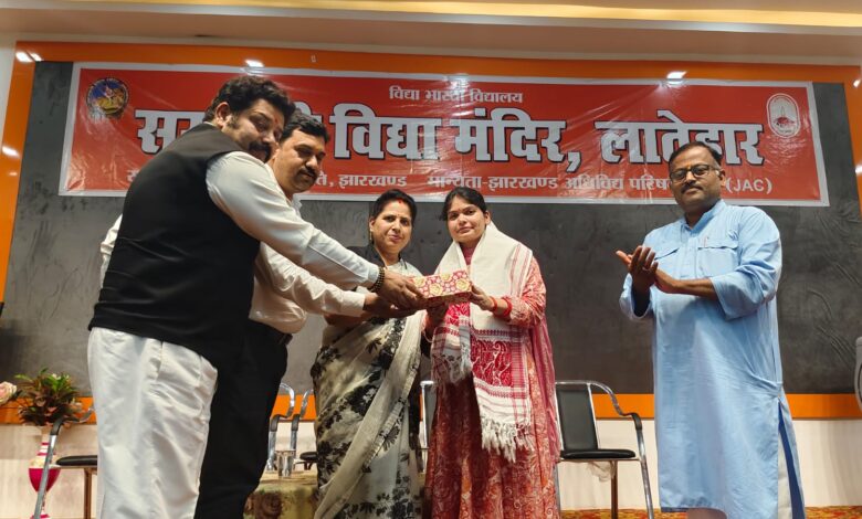 लातेहार। शहर के सरस्वती विद्या मंदिर, लातेहार की पूर्ववर्ती छात्रा अर्चना कुमारी का चयन जेपीएसएसी सिविल सर्विस में हुआ है. गुरूवार को विद्यालय के सभागार में एक कार्यक्रम आयोजित कर अर्चना को सम्मानित किया गया. अर्चना जेपीएससी की 11 वीं सिविल सेवा परीक्षा में 152 वीं रैंक हासिल किया है. कार्यक्रम का शुभारंभ विद्यालय प्रबंधकारिणी समिति के अध्यक्ष राजीव रंजन पांडेय, सचिव नरेंद्र कुमार पांडे, मातृ भारती अध्यक्ष रितू रानी एवं विद्यालय के प्रधानाचार्य उत्तम कुमार मुखर्जी के द्वारा संयुक्त रूप से मां सरस्वती के चित्र पर दीप प्रज्वलन एवं पुष्पाजंलि कर किया गया.