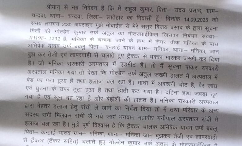 उन्होने बताया कि चंदवा जाने के क्रम मे सोमर चौक, मनिका के पास अभिषेक यादव उर्फ बबलू पिता कन्हाई यादव ने जानबूझ कर तेजी व लापरवाही से ट्रैक्टर चलाते हुए अतुल को धक्का मार कर जख्मी कर दिया है और वह गंभीर हालत में मनिका सामुदायिक स्वास्थ्य केंद्र में इलाजरत है. इसके बाद वह मनिका पहुंचा.