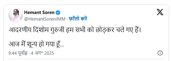 उनके निधन पर प्रधानमंत्री नरेंद्र मोदी व रक्षा मंत्री राजनाथ सिंह समेंत कई बड़े नेताओं ने शोक प्रकट किया है. शिबू सोरेन के निधन से पूरे देश में शोक की लहर है. वे झारखंड के बड़े नेता थे. उनके बेटे और झारखंड के सीएम हेमंत सोरेन ने उनके निधन की जानकारी देते हुए अपना दुख जाहिर किया. उन्होंने कहा कि आज मैं शून्य हो गया हूं.