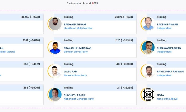 चौथे राउंड में बैद्यनाथ राम को 4521 और प्रकाश राम को 4053, पांचवें राउंड में बैद्यनाथ राम को 4081 और प्रकाश राम को 5847, छठे राउंड में बैद्यनाथ राम को 3655 और प्रकाश राम को 4493, सातवें राउंड में बैद्यनाथ राम को 4042 और प्रकाश राम को 4218 तथा आठवें राउंड में बैद्यनाथ राम को 3236 और प्रकाश राम को 4663 मत मिले. आठवें राउंड तक भाजपा के प्रकाश राम झामुमो के बैद्यनाथ राम से कुल 1593 मतों से आगे चल रहे थे.