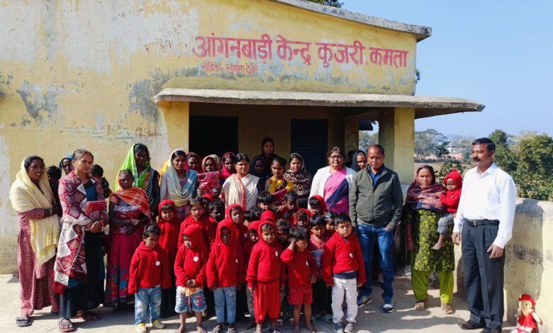 कुजरी आंगनबाड़ी केंद्र के बच्चों के बीच स्वेटर का वितरण