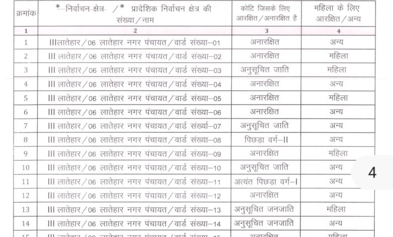 जारी सूची के अनुसार नगर पंचायत लातेहार के कुल 15 वार्डों में विभिन्न कोटियों एवं महिला व अन्य के लिए आरक्षण निर्धारित किया गया है. जिसमें वार्ड संख्या 1, 2, 4, 5, 6, 9, 12 और 15 अनारक्षित रखे गए हैं. वार्ड संख्या 2, 5,9 और 15 महिला अनारक्षित रखे गए है. इसके अलावा वार्ड संख्या 3,7, 10,13 और 14 अनुसूचित जाति के लिए आरक्षित किया गया है.