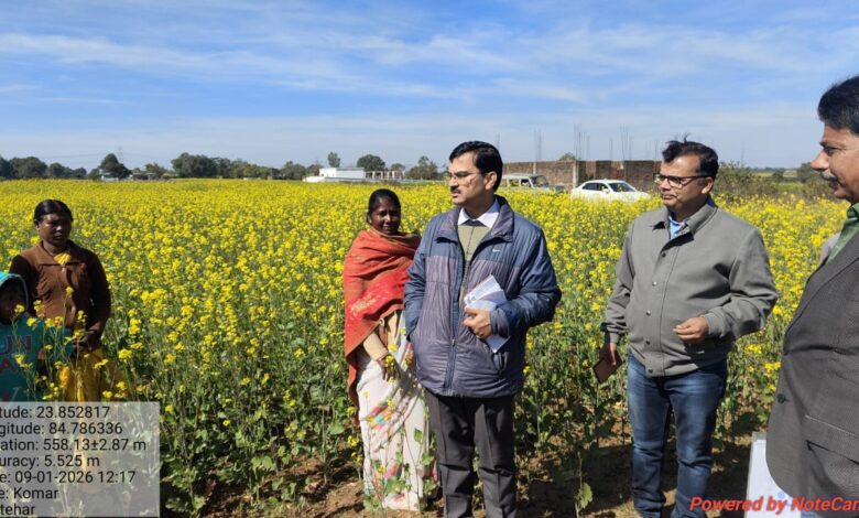 बालूमाथ (लातेहार)। शुक्रवार को बालुमाथ प्रखंड के कोमर गांव में सरसों फसल का निरीक्षण करने भारत सरकार के चावल विकास निदेशालय, पटना के निदेशक डॉ मान सिंह पहुंचे. यह सरसों की खेती राष्ट्रीय खाद्य सुरक्षा मिशन (एनएफएसएम) के अंतर्गत क्लस्टर फ्रंट लाइन डेमोन्स्ट्रेशन (सीएफएलडी) कार्यक्रम के तहत कृषि विज्ञान केंद्र, लातेहार द्वारा कराई जा रही है. कोमर गांव में दो क्लस्टरों में कुल 50 एकड़ भूमि पर सरसों की खेती की गई है. इस अवसर पर कृषि विज्ञान केंद्र, लातेहार के वरिष्ठ वैज्ञानिक एवं प्रमुख डॉ राजीव कुमार तथा पादप संरक्षण वैज्ञानिक डॉ गोपाल कृष्ण भी उपस्थित थे. डॉ मान सिंह ने खेतों का भ्रमण कर फसल की स्थिति का अवलोकन किया तथा कार्यक्रम से जुड़े किसानों से सीधा संवाद किया. उन्होंने धनेव उरांव, जाबा देवी, मुकेश उरांव, लक्ष्मण उरांव, विनोद उरांव सहित अन्य किसानों से खेती से जुड़ी समस्याओं, उत्पादन लागत और तकनीकी पहलुओं पर चर्चा की. निदेशक ने कुछ किसानों के खेतों को “कृषि मैपर” मोबाइल एप्लीकेशन के माध्यम से मैप भी किया. इस अवसर पर लगभग 50 लाभार्थी किसान उपस्थित थे. उल्लेखनीय है कि इस योजना के अंतर्गत केवीके लातेहार द्वारा लातेहार जिले के विभिन्न गांवों में कुल 19 क्लस्टर बनाकर लगभग 500 एकड़ क्षेत्र में 500 किसानों द्वारा सरसों की खेती कराई जा रही है. डॉ मान सिंह ने किसानों को उन्नत किस्मों के बीज, संतुलित उर्वरक प्रयोग, कीट-रोग प्रबंधन तथा वैज्ञानिक पद्धति से खेती करने की सलाह दी. जिससे उत्पादन और आय में वृद्धि हो सके. कृषक विज्ञान केंद्र के वैज्ञानिकों ने भी किसानों को सरसों की उन्नत तकनीकों की जानकारी दी और भविष्य में हर संभव तकनीकी सहयोग का आश्वासन दिया.