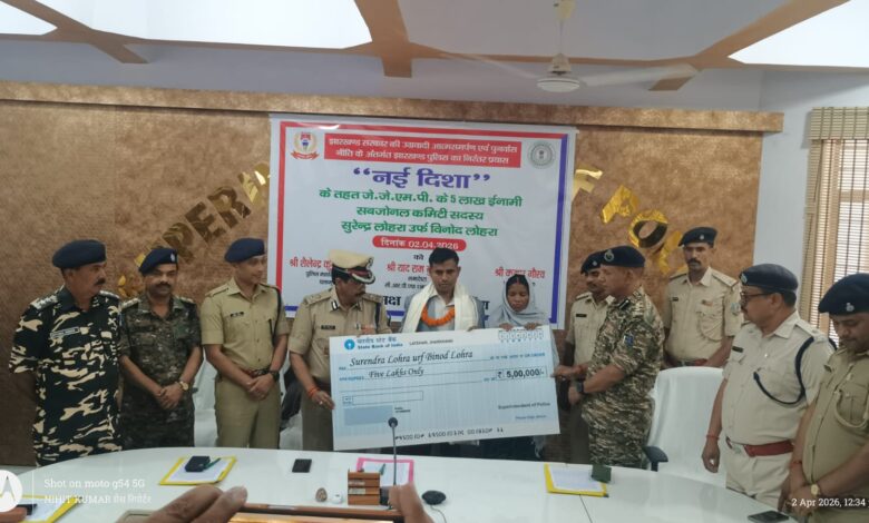 लातेहार। दो अप्रैल को प्रतिबंद्धित उग्रवादी संगठन जेजेएमपी का सब जोनल कमांडर सुरेंद्र लोहरा उर्फ टाइगर जी उर्फ विनोद लोहरा ने पुलिस के समक्ष आत्मसपमर्ण कर दिया है. पुलिस मुख्यालय, लातेहार में आयोजित एक कार्यक्रम में उसने पुलिस महानिरीक्षक पलामू प्रक्षेत्र शैलेंद्र कुमार सिन्हा, पुलिस अधीक्षक कुमार गौरव और सीआरपीएफ के 11 वीं बटालियन के कमाडेंट यादराम बुनकर के समक्ष आत्मसमपर्ण किया. इस दौरान आईजी श्री सिन्हा ने सुरेंद्र लोहरा का माल्यापर्ण किया और बुके भेंट कर समाज के मुख्यधारा में लौटने का स्वागत किया. उन्होने उसे पांच लाख रूपये का प्रतीकात्मक चेक भी सौंपा.
