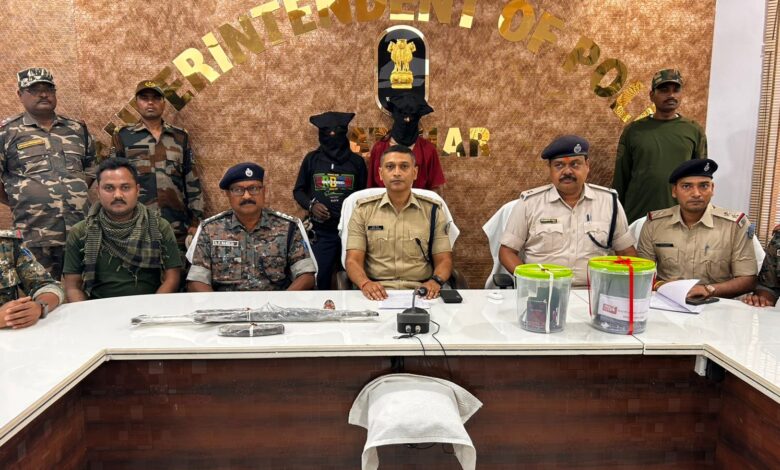 लातेहार। पुलिस अधीक्षक कुमार गौरव को मिली गुप्त सूचना पर पुलिस न माओवादियों के जोनल कमाडंर मृत्युंजय भुईयां उर्फ फ्रेश भुईयां व माओवादी सदस्य बबलू राम उर्फ रोहित उर्फ बबलू चंद्रवंशी को गिरफ्तार कर जेल भेज दिया है. मृत्युंजय भुईयां पर दस लाख व बबलू राम पर सरकार ने दो रूपये का इनाम रखा है. पुलिस अधीक्षक कार्यालय में एक प्रेस वार्ता में इस आशय की जानकारी पुलिस अधीक्षक कुमार गौरव ने दी.