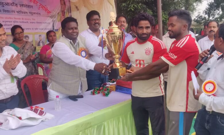 लातेहार। खेल स्टेडियम, महुआडांड़ में रविवार को स्व रियाजुद्दीन अहमद स्मृति क्रिकेट टूर्नामेंट का समापन हो गया. इससे पहले खेले गये फाइनल मैच में बतौर मुख्य अतिथि विधायक रामचंद्र सिंह एवं विशिष्ट अतिथि के रूप में एसडीओ बिपिन कुमार दुबे मौजूद थे. मौके पर विधायक ने कहा क‍ि प्रतिस्‍पर्द्धाओं से खेल प्रतिभाओं का आगे निकलने का मौका मिलता है. खेल हमारे जीवन का महत्‍वपूर्ण अंग है. एसडीओ ने भी खेलों के महत्‍व पर प्रकाश डाला.  टूर्नामेंट में कुल 16 टीम ने भाग लिया था. फाइनल मैच शहीद क्लब और कलाम क्लब के बीच खेला गया. रोमांचक मुकाबले में शहीद क्लब ने कलाम स्पोर्ट्स क्लब को छह रनों से हरा दिया.  शहीद क्लब ने पहले बल्लेबाजी करते हुए 12 ओवर में 94 बनाए. जबकि कलाम क्लब निर्धारित 12 ओवर में 88 रन ही बना सकी.  विजेता शहीद क्लब को 31,000 रुपये नकद एवं ट्रॉफी और उपविजेता टीम को 21,000 रुपये नकद एवं ट्रॉफी दिया गया. वहीं जुगनू फैशन की ओर से विजेता टीम को 10,000 रुपए का जगद पुरस्कार दिया गया. मैन ऑफ़ द मैच का पुरस्कार कलाम क्लब के महसर अंसारी व मैन ऑफ द सीरीज का पुरस्कार राजा स्पार्की को दिया गया. बेस्ट कैच टेकर का पुरस्कार दिलीप व बेस्ट बॉलर का पुरस्कार शुभम को दिया गया.  टूर्नामेंट के को-ऑर्डिनेटर ने बताया कि इस वार्षिक आयोजन का उद्देश्य क्षेत्र के युवाओं को खेल के माध्यम से राष्ट्रीय स्तर पर पहचान दिलाना है. मंच का संचालन महताब आलम और लक्की अली ने किया.  फाइनल मैच में अंपायरिंग शमशाद अहमद और मुजाहिद अहमद ने की. मौके पर बीडीओ संतोष बैठा, संत जोसेफ के प्राचार्य फादर दिलीप, उप प्रमुख अभय मिंज, कांग्रेस प्रदेश प्रतिनिधि इफ्तेखार अहमद, कांग्रेस युवा प्रखंंड अध्यक्ष अमीर सुहेल, अजीत पाल कुजूर, रामनरेश ठाकुर, नूरूल अंसारी, रानू खान, सहित कई गणमान्य व्यक्ति एवं सैकड़ों खेलप्रेमी मौजूद थे.