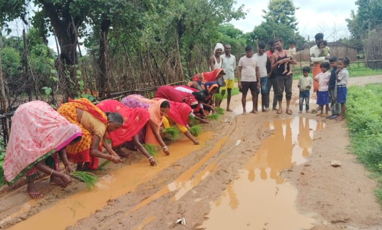 ग्रामीणों ने सड़क पर धनरोपनी कर किया प्रदर्शन