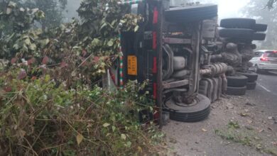 टाइल्स लदा ट्रक दुर्घटनाग्रस्त, बाल बाल बचा चालक
